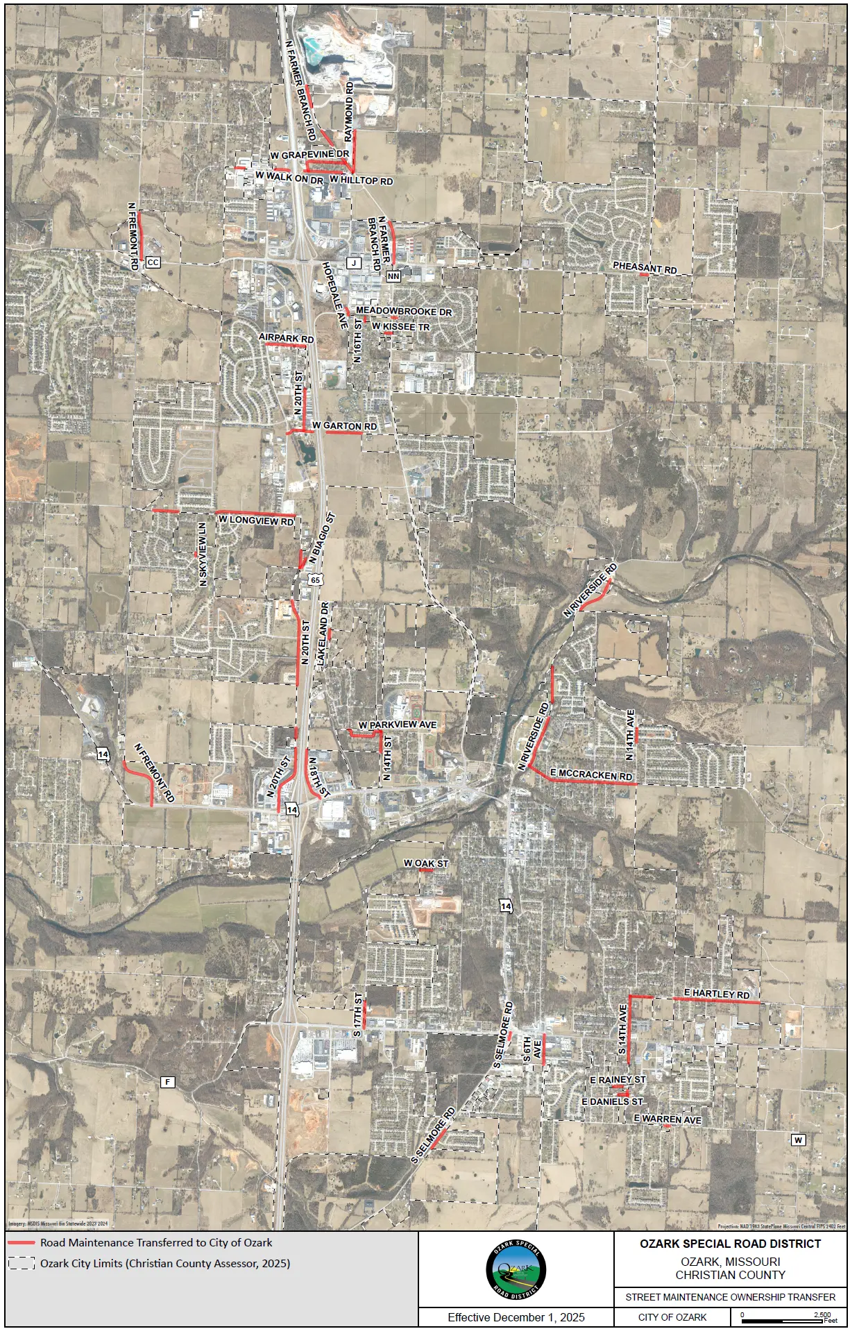 The Road District has prepared a street map that marks the streets and roads that the Road District will control and those that the City of Ozark will control. That map will be available on the Road District website at osrdmo.gov. You may also contact the Road District office at (417) 581-1632.